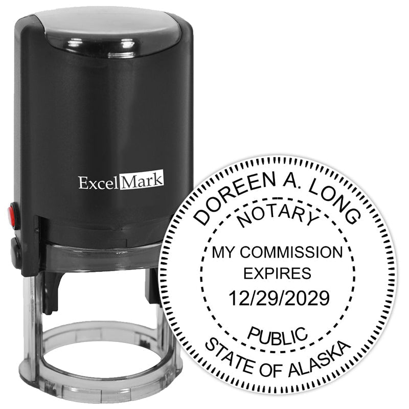 This Alaska notary stamp for professional notaries creates a high quality seal impression using a round self-inking notary stamp. A self-inking notary stamp mount re-inks the rubber die into the self-contained ink pad before each impression, making it ideal for quick, repetitive stamping during those busy work days. In addition, the ExcelMark self-inking brand features a unique, reversible (two-sided) ink pad that doubles the life of the pad. Simply push it out, flip it over, reinsert and keep stamping! Each side of your ExcelMark ink pad initially lasts for thousands of impressions and is simple to re-ink and replace. A clear base on the mount allows you to easily line up those impressions.