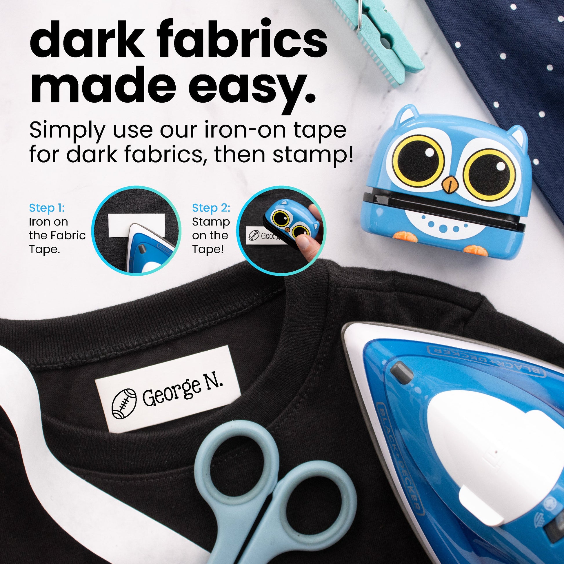 - IRON-ON NAME TAPE: We offer a tape that you can iron on to fabrics, perfect for dark clothing! Simply iron the tape onto your clothing and stamp onto the tape.