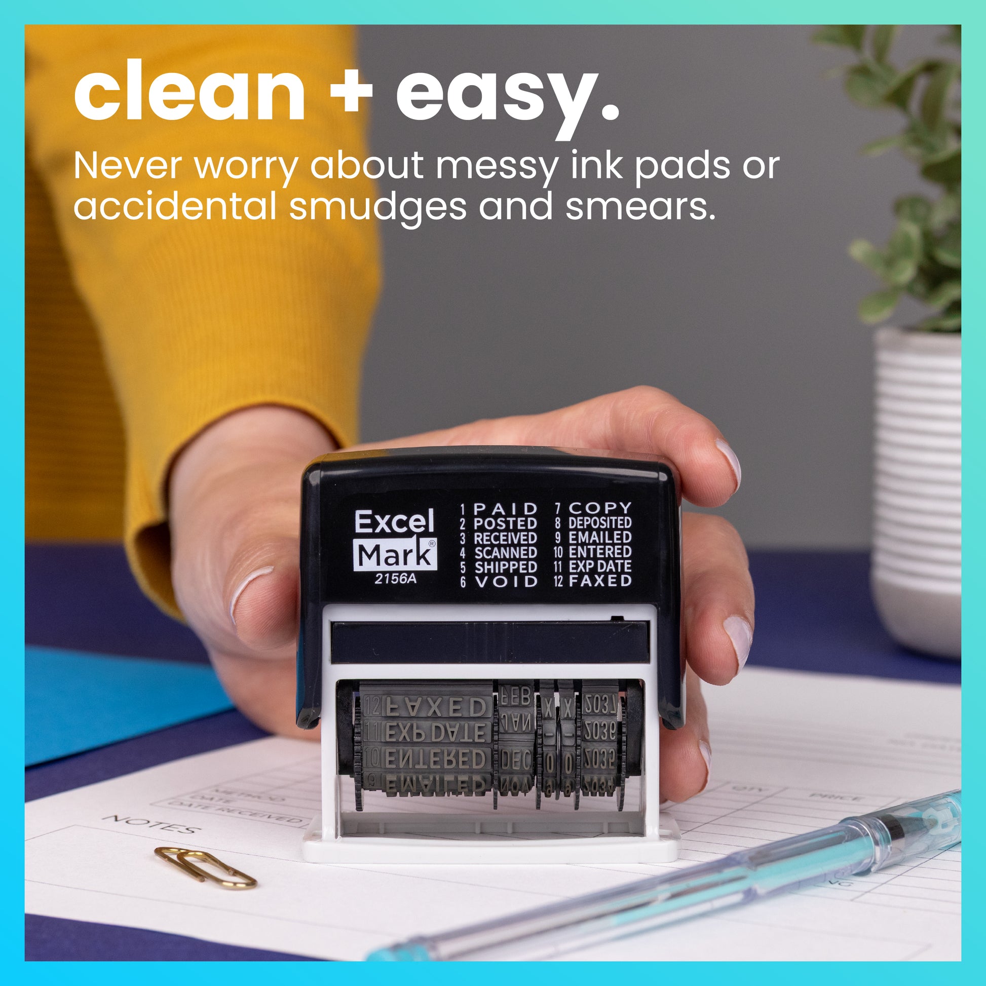 ExcelMark's 12 Phrase Date Stamp offers a better quality stamp than most daters. With 12 years worth of dates, this stamp is built to last for a long time. Message and date are easily changed by rotating bands.