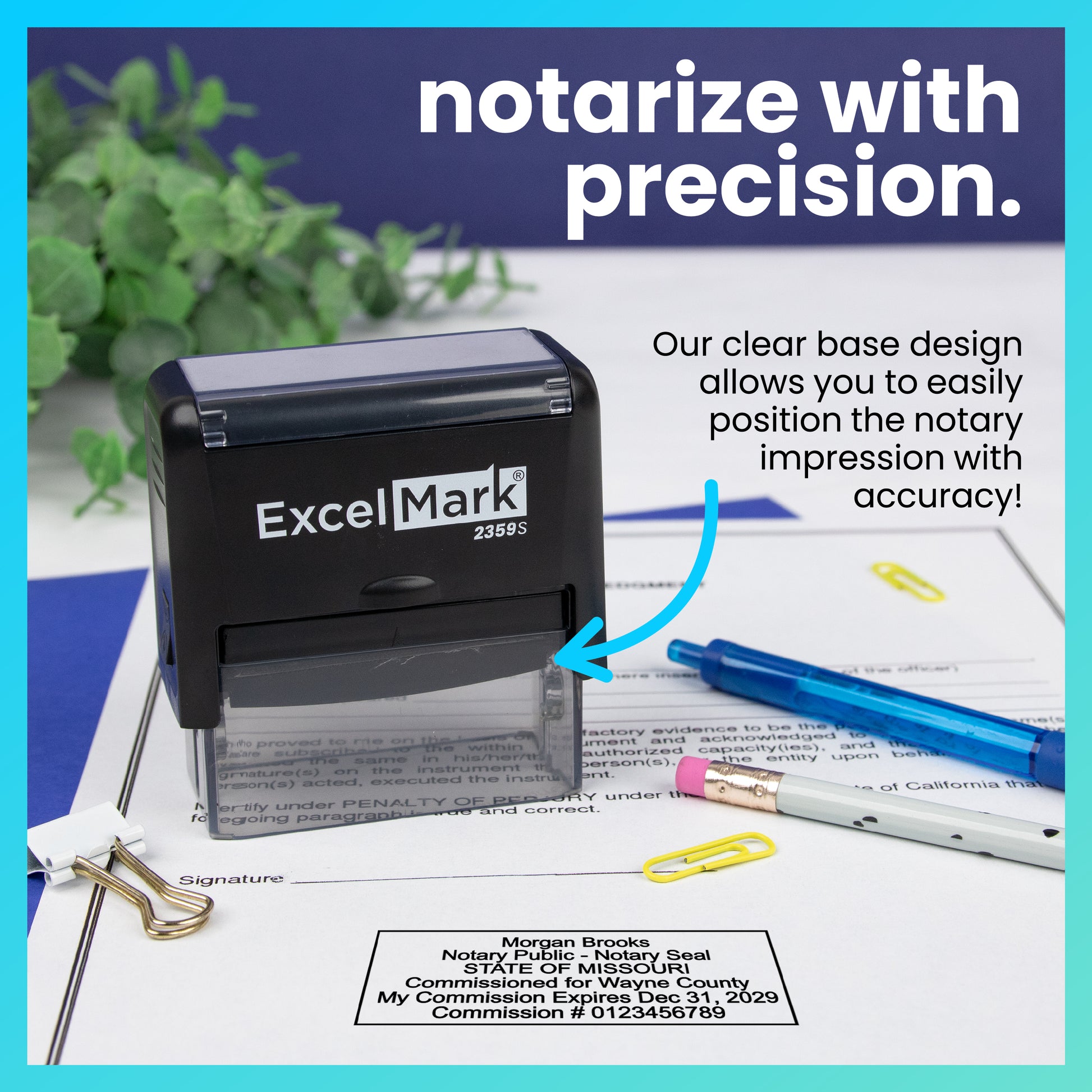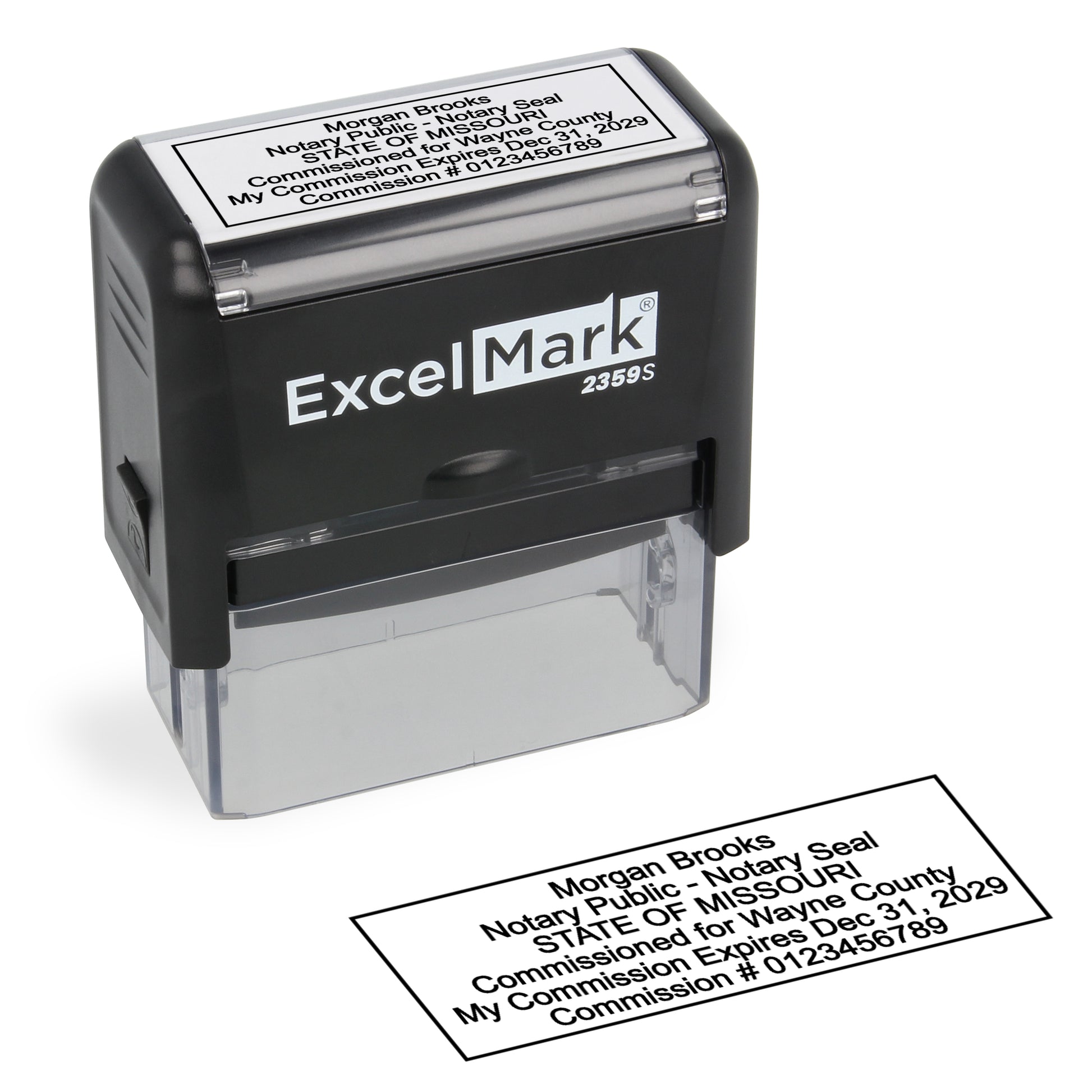 This Missouri notary stamp for professional notaries creates a high quality seal impression using a rectangle self-inking notary stamp. A self-inking notary stamp mount re-inks the rubber die into the self-contained ink pad before each impression, making it ideal for quick, repetitive stamping during those busy work days. Each side of your ExcelMark ink pad initially lasts for thousands of impressions and is simple to re-ink and replace. A clear base on the mount allows you to easily line up those impressions.