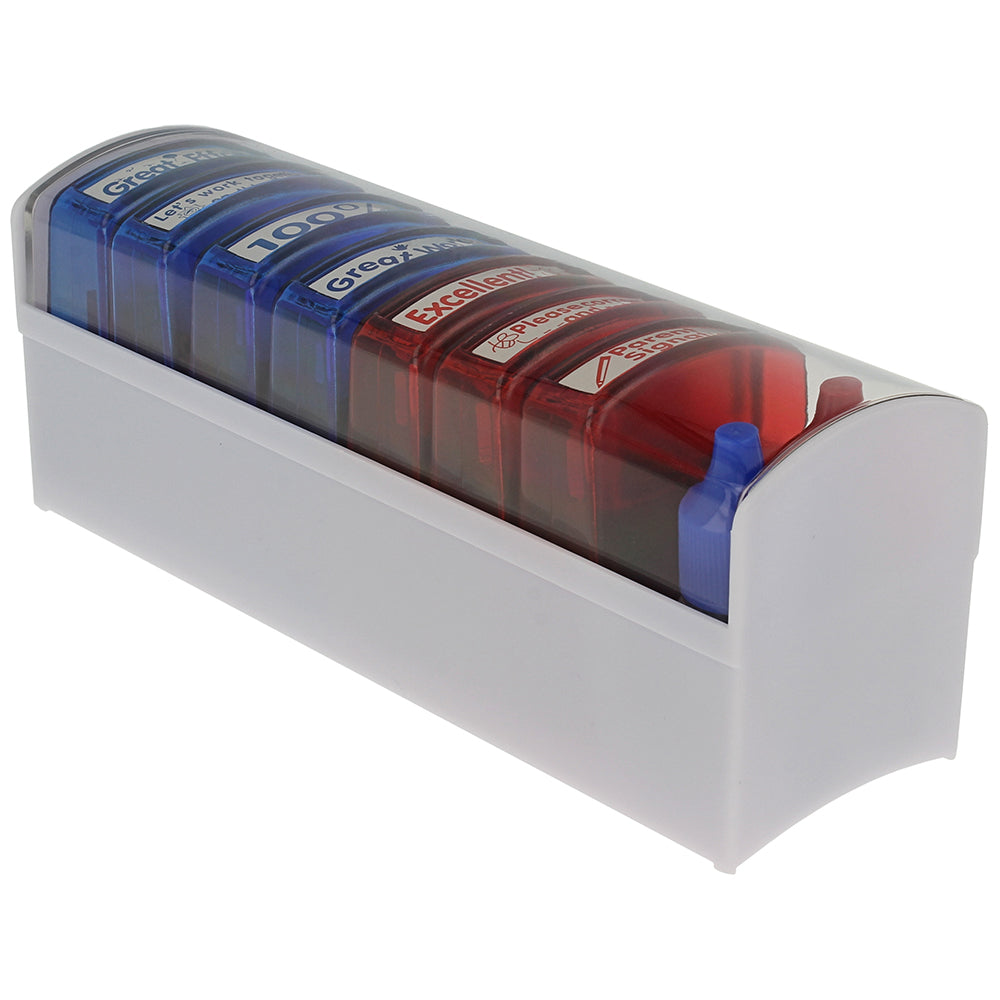 - Set includes 7 stamps, red refill ink, blue refill ink and storage tray