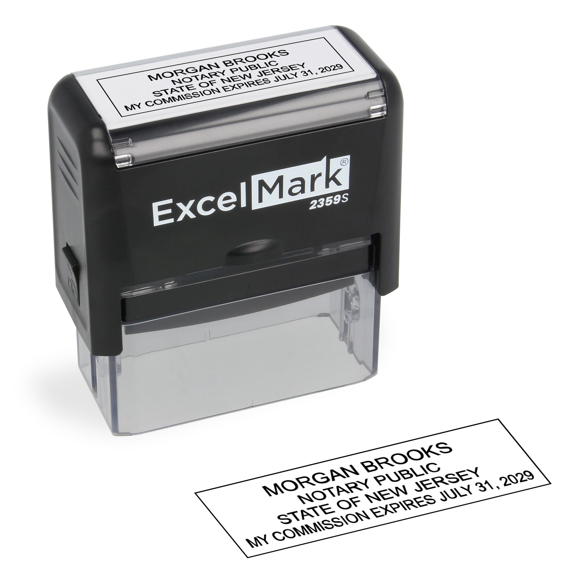 This New Jersey notary stamp for professional notaries creates a high quality seal impression using a rectangle self-inking notary stamp. A self-inking notary stamp mount re-inks the rubber die into the self-contained ink pad before each impression, making it ideal for quick, repetitive stamping during those busy work days. Each side of your ExcelMark ink pad initially lasts for thousands of impressions and is simple to re-ink and replace. A clear base on the mount allows you to easily line up those impressions.