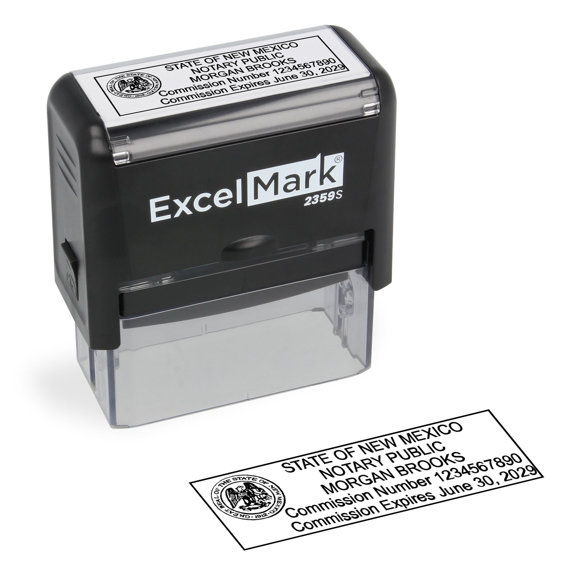 This New Mexico notary stamp for professional notaries creates a high quality seal impression using a rectangle self-inking notary stamp. A self-inking notary stamp mount re-inks the rubber die into the self-contained ink pad before each impression, making it ideal for quick, repetitive stamping during those busy work days. Each side of your ExcelMark ink pad initially lasts for thousands of impressions and is simple to re-ink and replace. A clear base on the mount allows you to easily line up those impressions.
