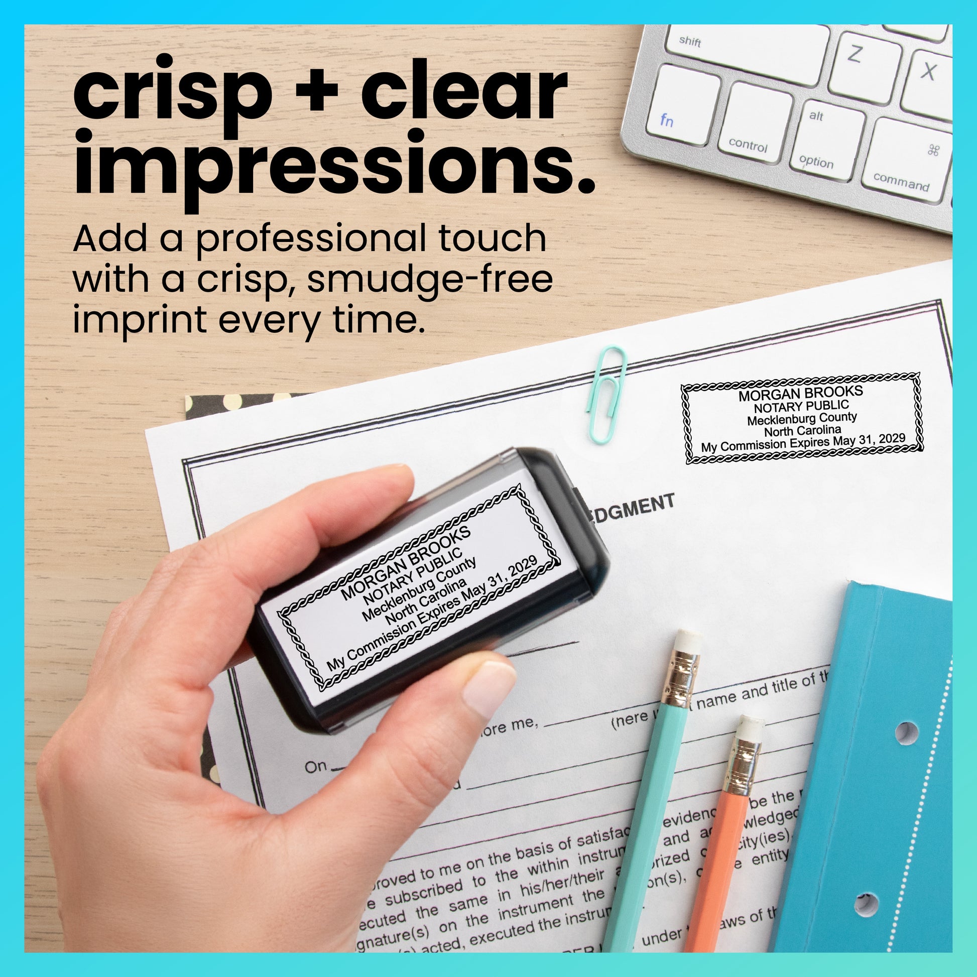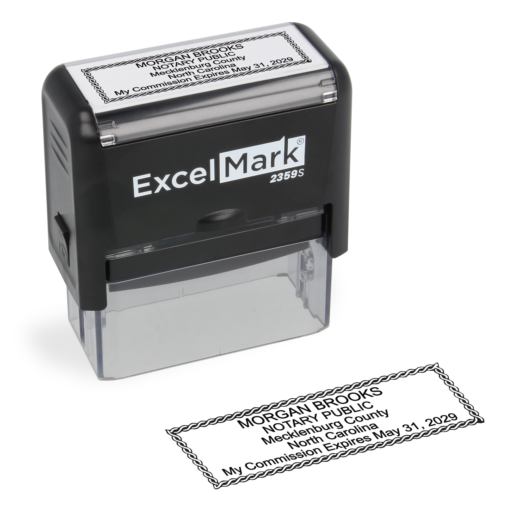 This North Carolina notary stamp for professional notaries creates a high quality seal impression using a rectangle self-inking notary stamp. A self-inking notary stamp mount re-inks the rubber die into the self-contained ink pad before each impression, making it ideal for quick, repetitive stamping during those busy work days. Each side of your ExcelMark ink pad initially lasts for thousands of impressions and is simple to re-ink and replace. A clear base on the mount allows you to easily line up those impressions.