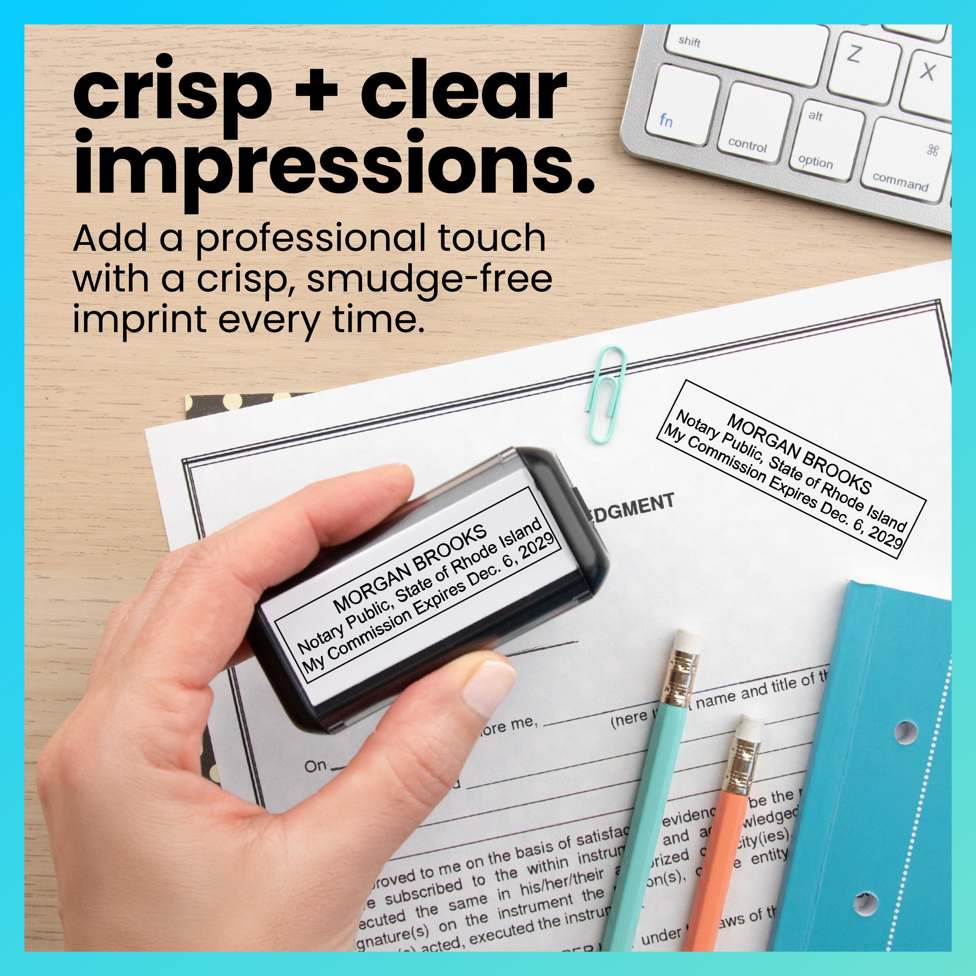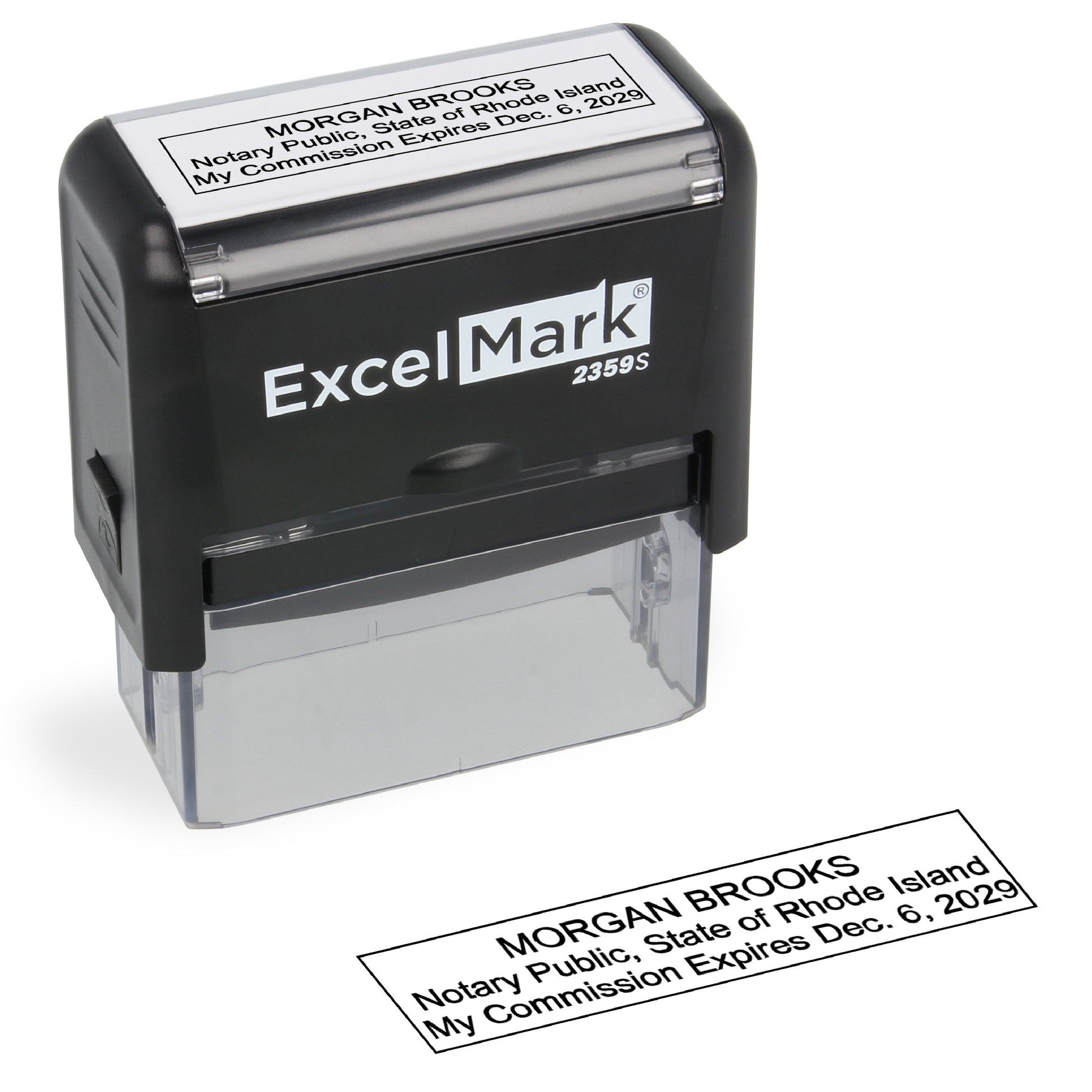 This Rhode Island notary stamp for professional notaries creates a high quality seal impression using a rectangle self-inking notary stamp. A self-inking notary stamp mount re-inks the rubber die into the self-contained ink pad before each impression, making it ideal for quick, repetitive stamping during those busy work days. Each side of your ExcelMark ink pad initially lasts for thousands of impressions and is simple to re-ink and replace. A clear base on the mount allows you to easily line up those impressions.